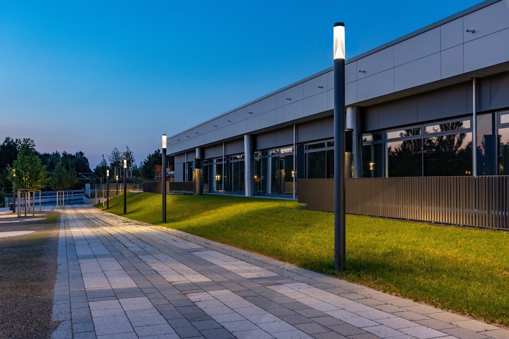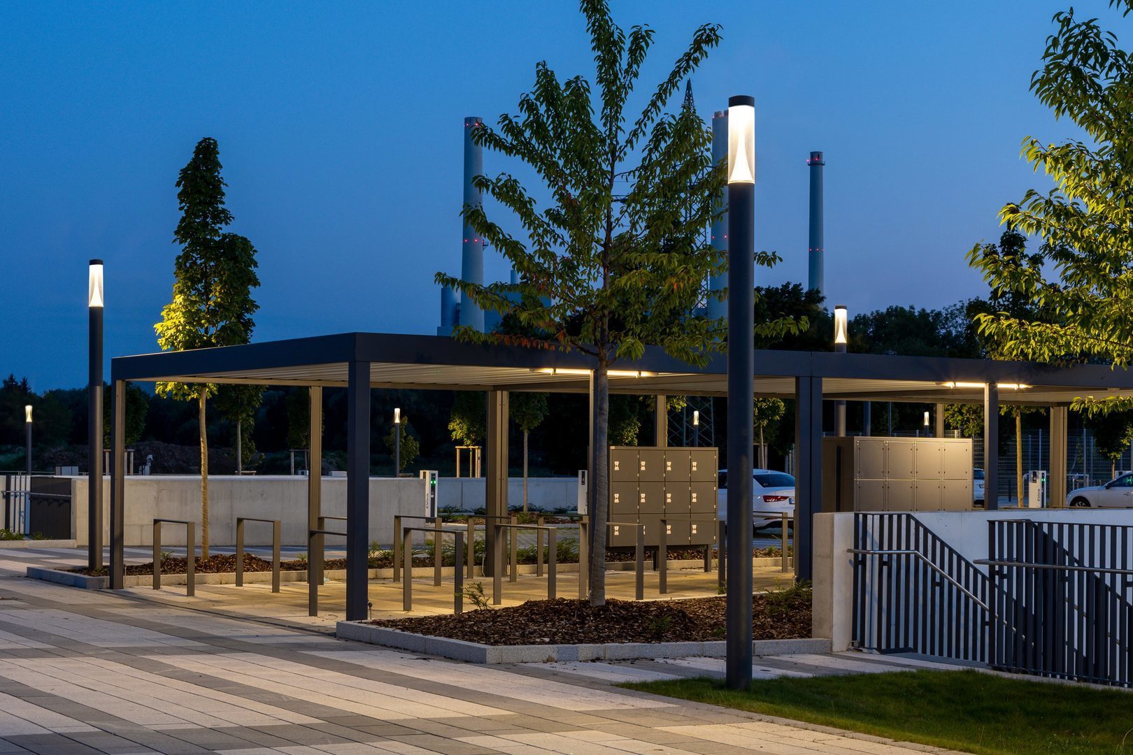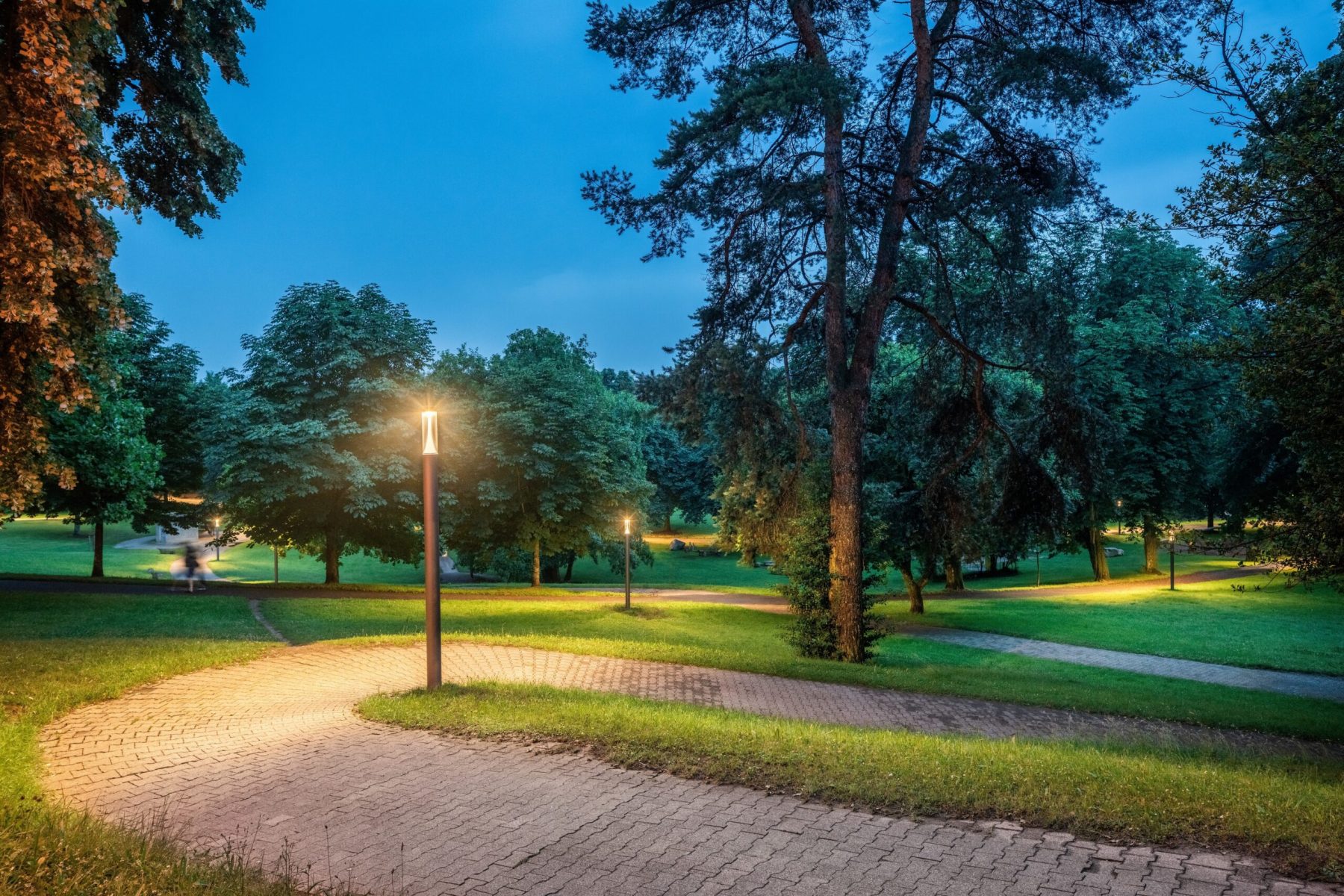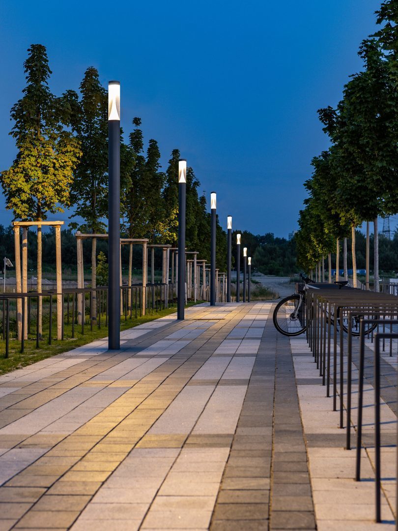 Gångzoner, torg, stigar i parker och grönområden, bostäder, trappor, entréer, runt byggnader.