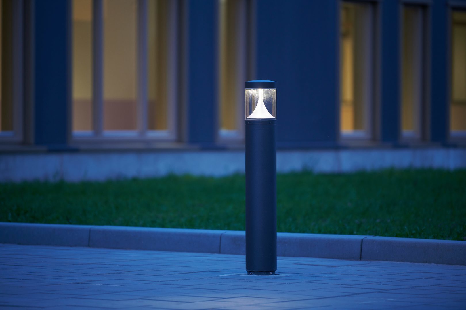 Pollare med rund, konformad opal PMMA-reflektor. Kan användas i olika utföranden och höjder i kombination med pollarben (beställs separat).