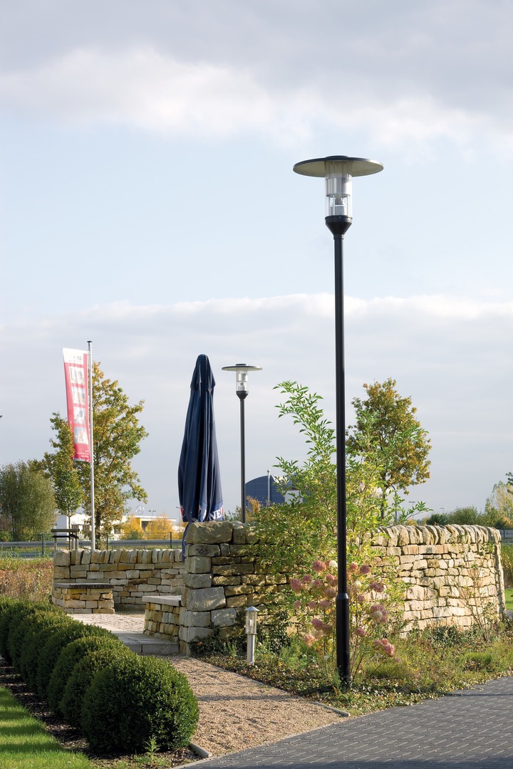 Luminaire body of die-cast aluminium, luminaire canopy of corrosion-resistant aluminium, powder-coated highly weather resistant. Colour of outer luminaire body and luminaire top deep black, similar to RAL 9005. Luminaire top white powder-coated on inside. Sea weather-suitable coating on request. Cylindrical cover of impact-resistant PMMA, clear. Luminaire cover in lock-in service position can be pushed upwards. Mast available upon request. Safety class (EN 61140): II, protection rating (DIN EN 60529): IP23, Protection rating of lamp compartment: IP65. impact resistance level in accordance with IEC 62262: IK04. Permissible ambient temperature (ta): 25 °C Windage area Fw = 0,470 m2. Weight: 9,1 kg.