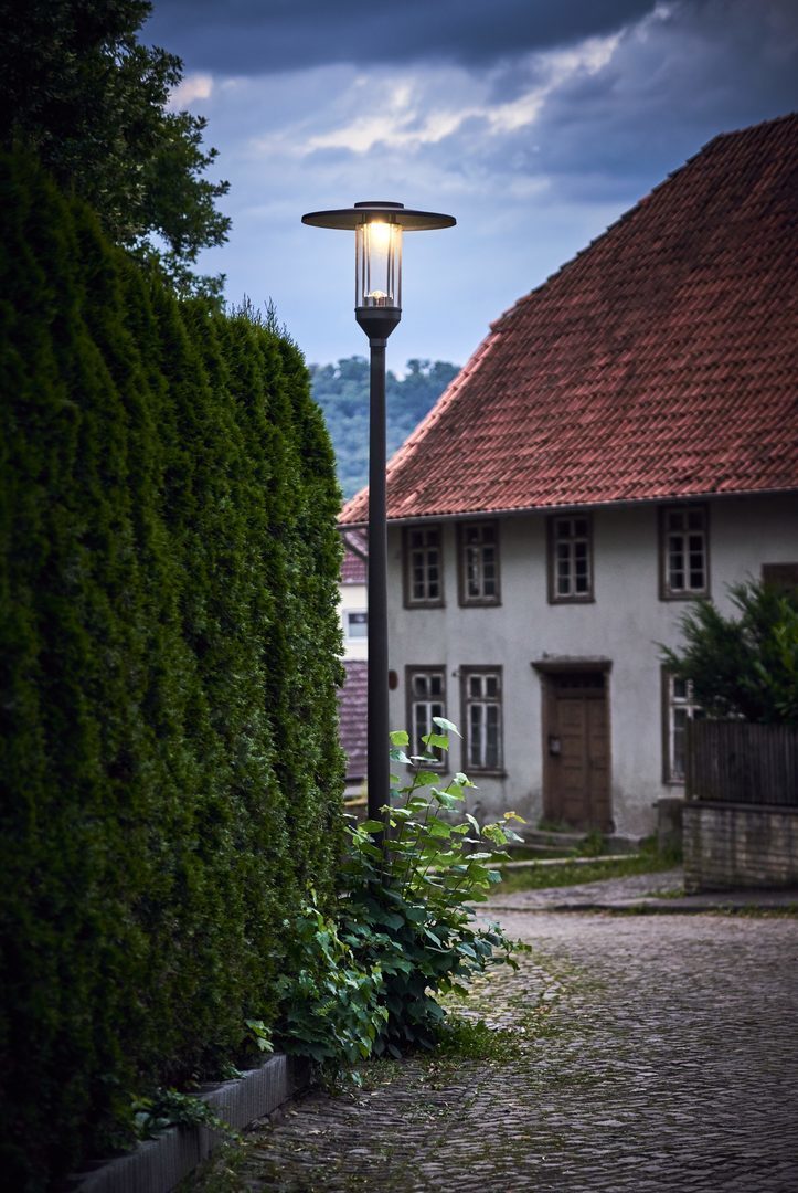 Decorative lanterns for mast-top mounting. With an intelligent label for quick access to luminaire information by means of QR code.