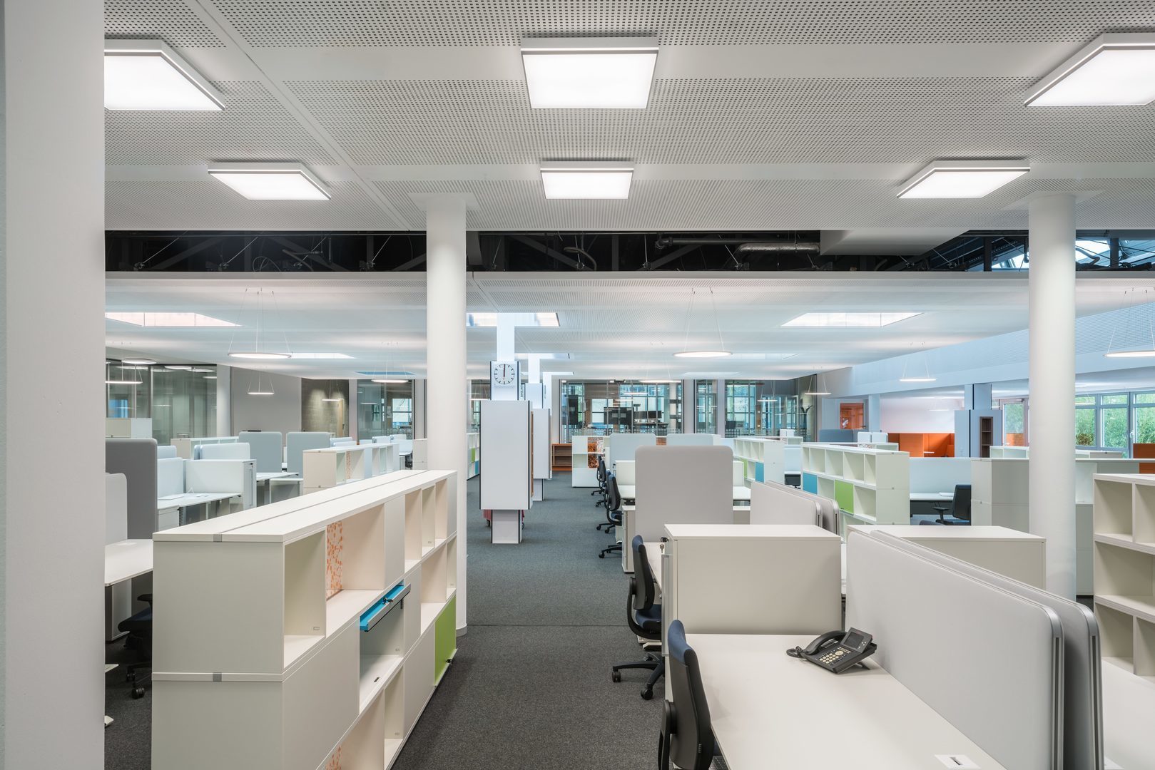 Med högeffektiv mikroprismatisk optik CDP. Helt harmonisk ljuseffekt genom jämnt upplyst ljusöppning. Direktstrålande. Bländningsbegränsning (EN 12464-1) enligt UGR < 19. Bildskärmsanpassad enligt EN 12464-1 genom begränsad ljustäthet L ≤ 1 500 cd/m² för utstrålningsvinklar över 65° runtom.