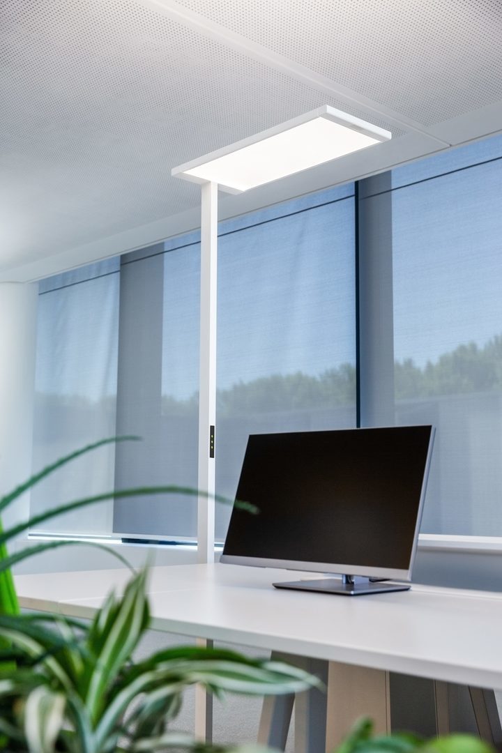 Med sin breda, milt asymmetriska ljusfördelning ger den direkta ljuskomponenten i armaturen en mycket jämn belysning av skrivbordsytan. Den indirekta ljuskomponenten med Lambertian ljusfördelning ger optimal rumsbelysning. Bländningsutvärdering enligt UGR-klassificering (EN 12464-1) < 16. VDU-arbetsstation-kompatibel i enlighet med 12464-1