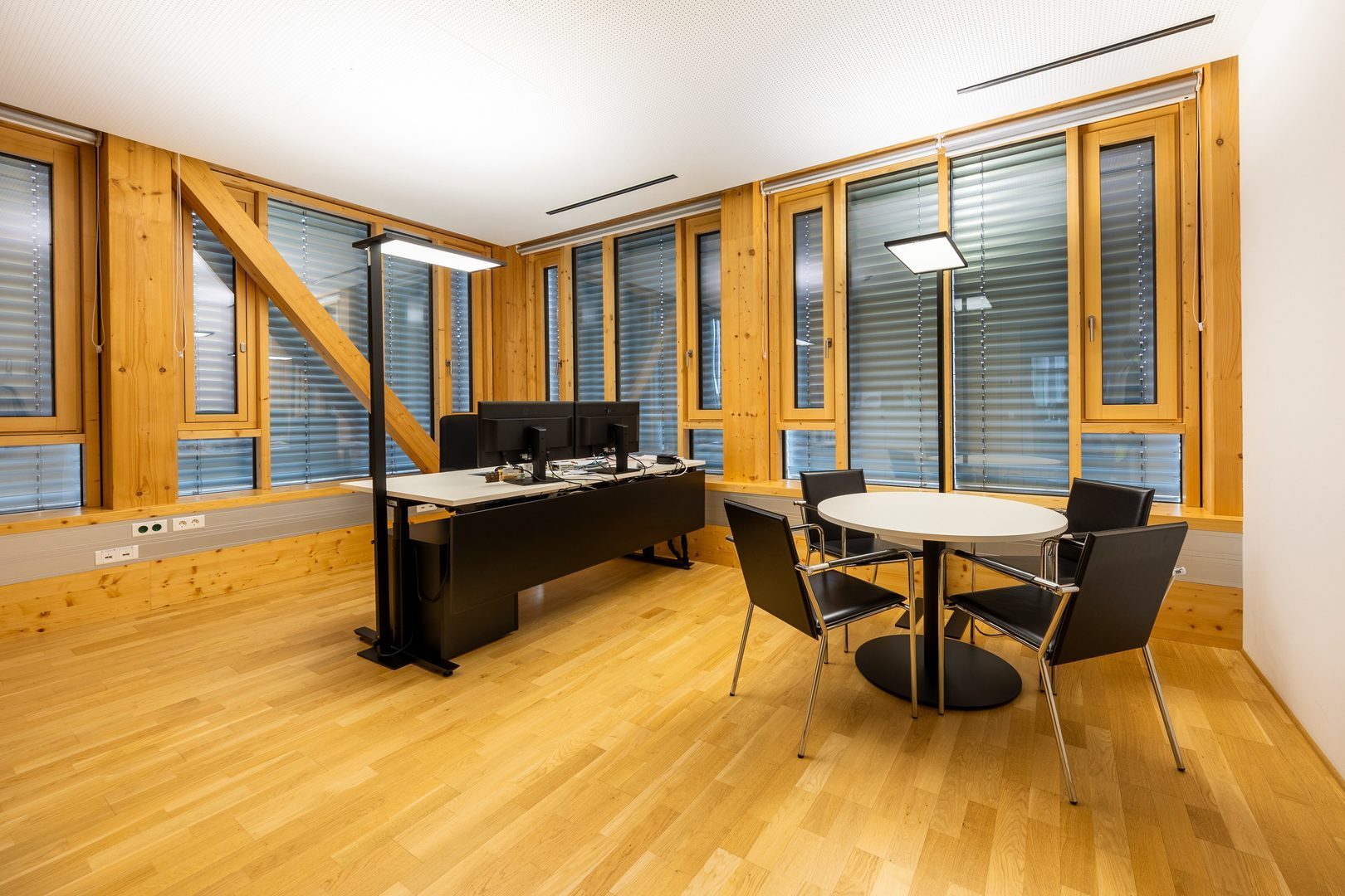 Exklusiv fristående LED-armatur med 2 separat styrbara armaturhuvuden, direkt och indirekt ljusfördelning. För standard-kompatibel belysning av motsatta dubbla arbetsstationer, speciellt om de är avskärmade av skyddspaneler.