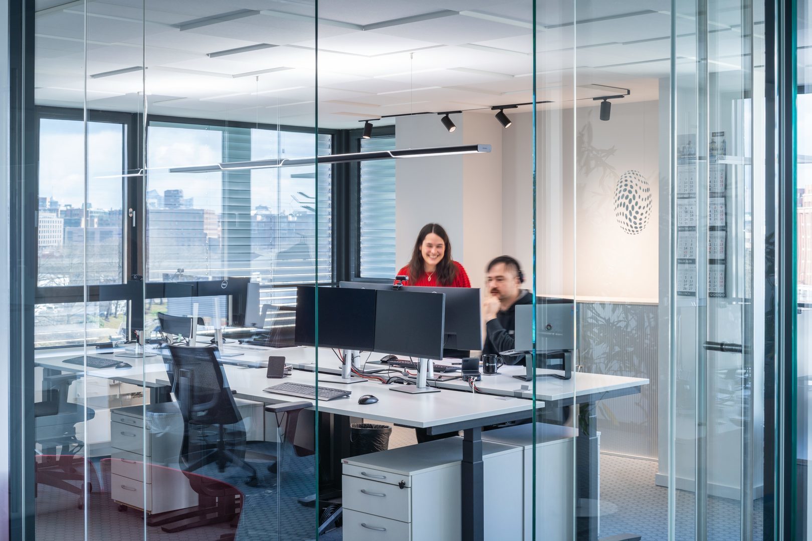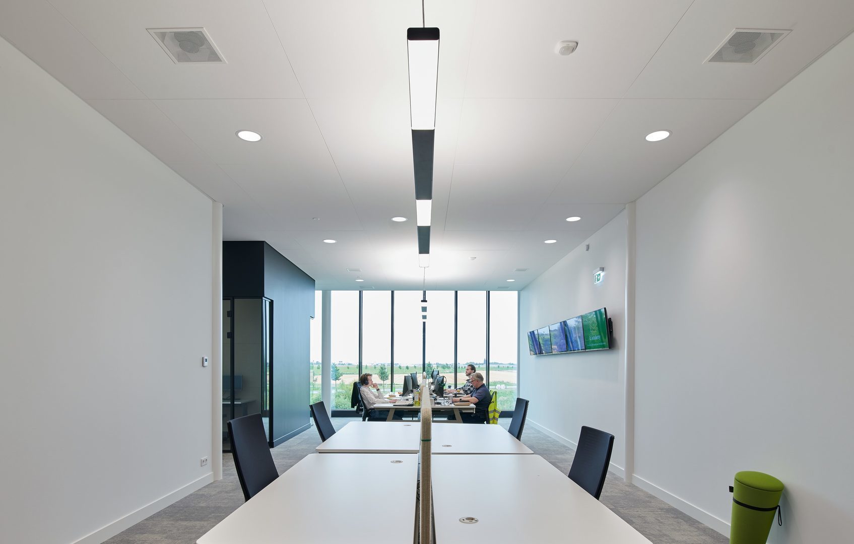 Parelia LED som är lämplig som linjearmatur lämpar sig perfekt för belysningskoncept som är parallella med byggnadens axel. Den kan placeras centralt över skrivbordet utan att bländande reflexer uppstår av den direkta andelen. Den sidoriktade ljuslinjen ger dessutom en attraktiv rumsatmosfär.