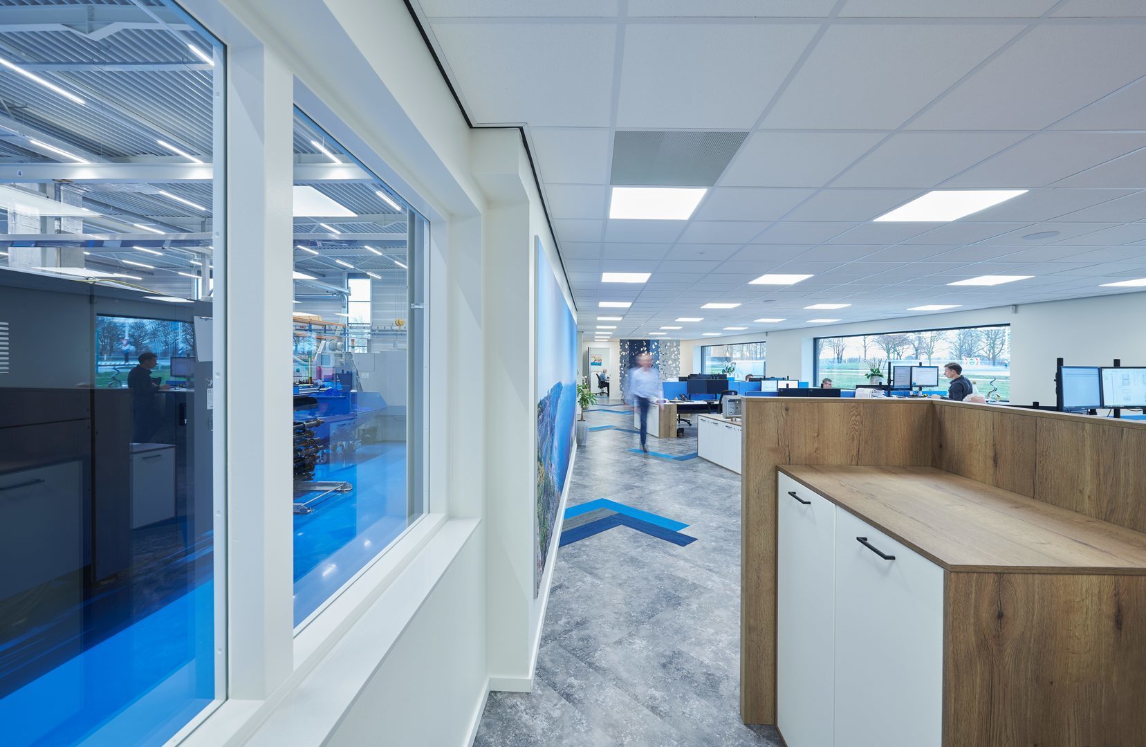 Mikroprismatiskt täckglas av PMMA. Med smal/bredstrålande ljusfördelning. Bländningsbegränsning (EN 12464-1) enligt UGR < 19. Bildskärmsanpassad enligt EN 12464-1 genom begränsad ljustäthet L ≤ 3000 cd/m² för utstrålningsvinklar över 65° runtom. Harmonisk ljuseffekt genom jämnt upplyst ljusöppning.